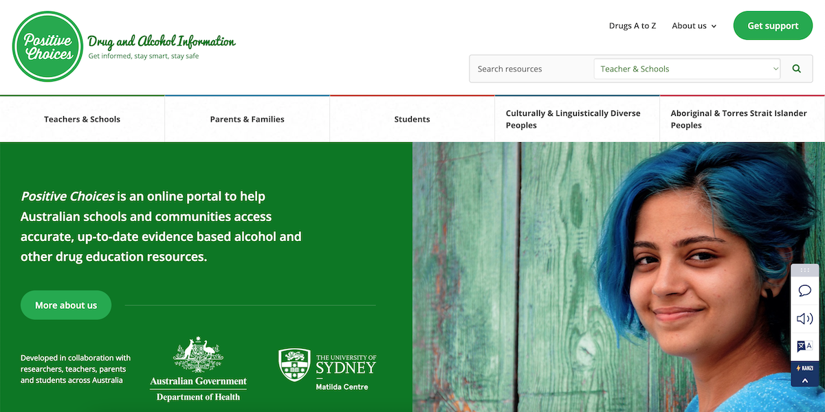 Positive Choices is an online portal that helps school communities access accurate, up-to-date drug education resources and prevention programs. Research suggests the teenage years are when alcohol and other drug use are first initiated. This highlights the importance of intervening early with young people to prevent drug use uptake and associated harms.